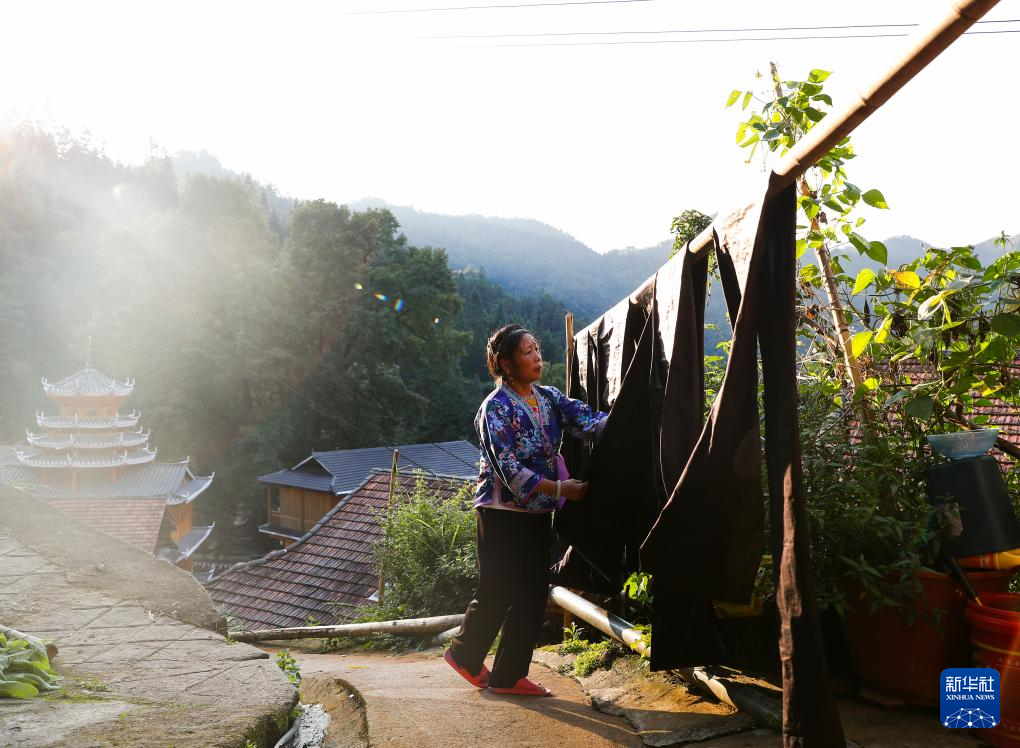 乌英苗寨妇女梁足英在晾晒还未完工的亮布(8月30日摄)。