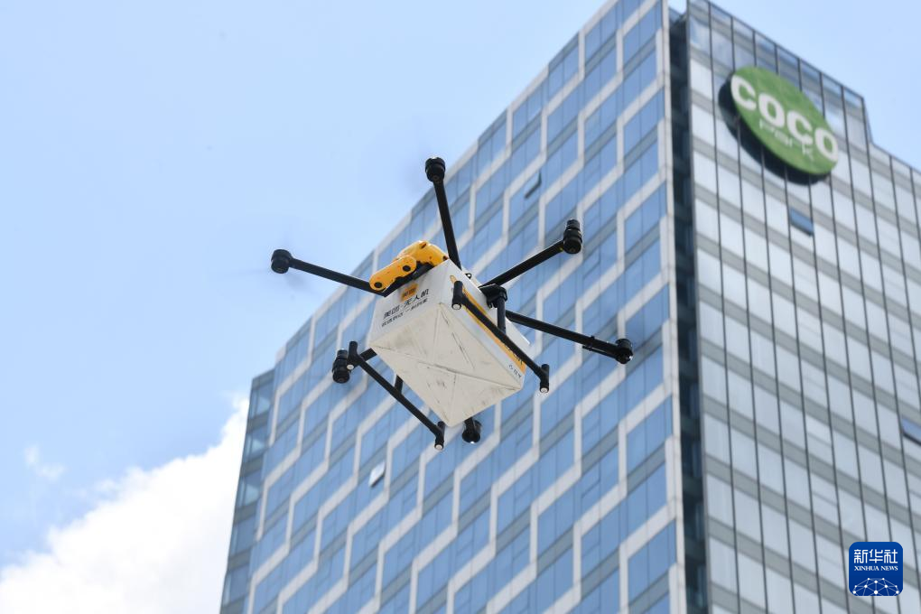 在深圳市龙岗区,一架送餐无人机穿行在高楼大厦间(8月15日摄)。