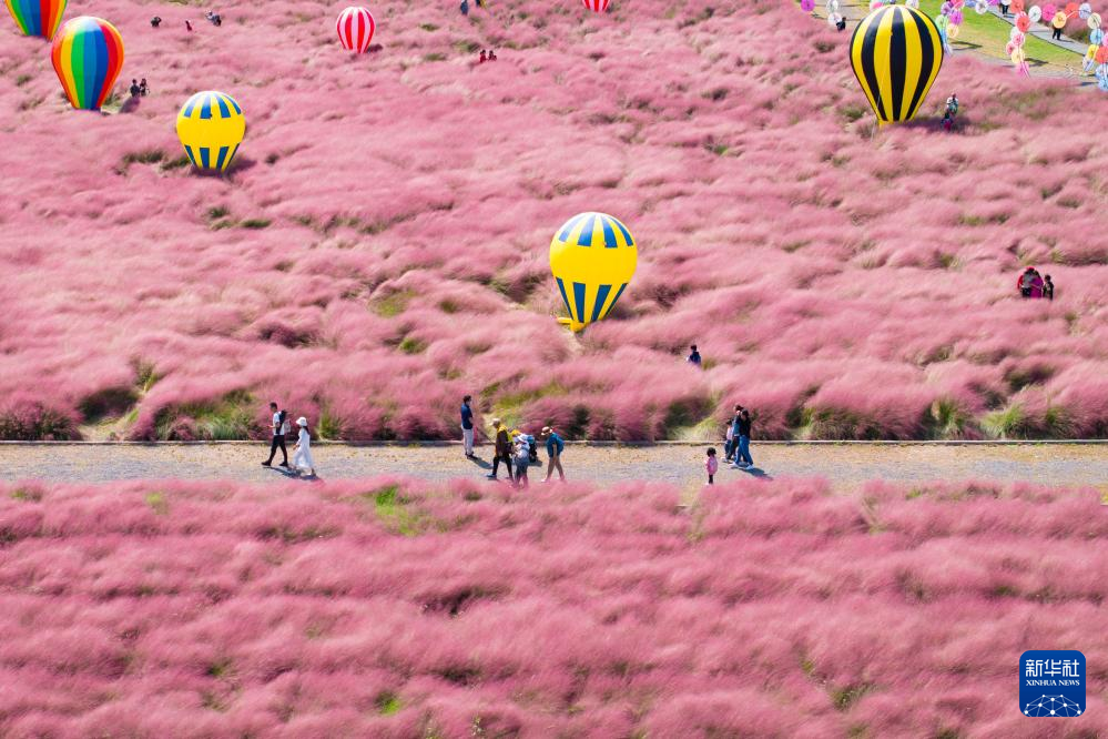 10月5日,在江苏省南京八卦洲陌上花渡,游人在粉黛乱子草丛中游玩(无人机照片)。