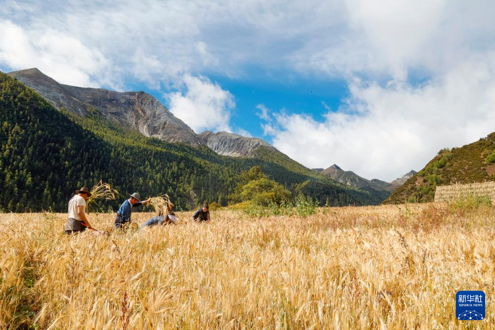 10月12日,在四川甘孜藏族自治州稻城县亚丁村,村民在收割青稞。