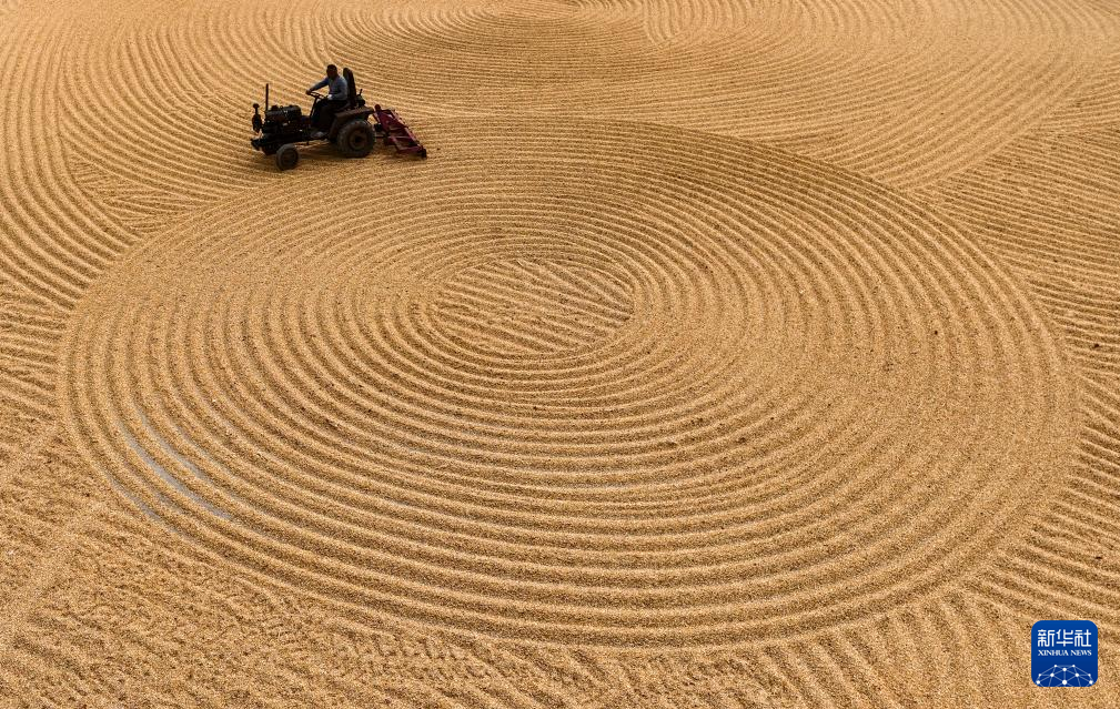 金秋时节,农民忙着收获晾晒,丰收图景美如画。