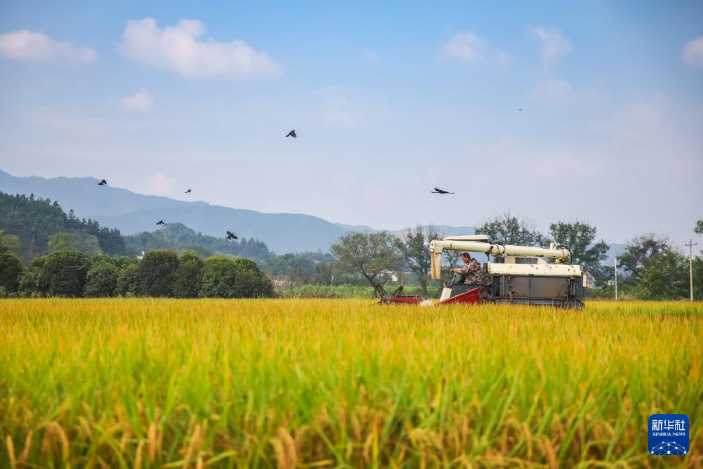 10月12日,在湖南省永州市蓝山县塔峰镇,农机手驾驶收割机在田间收割晚稻。