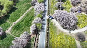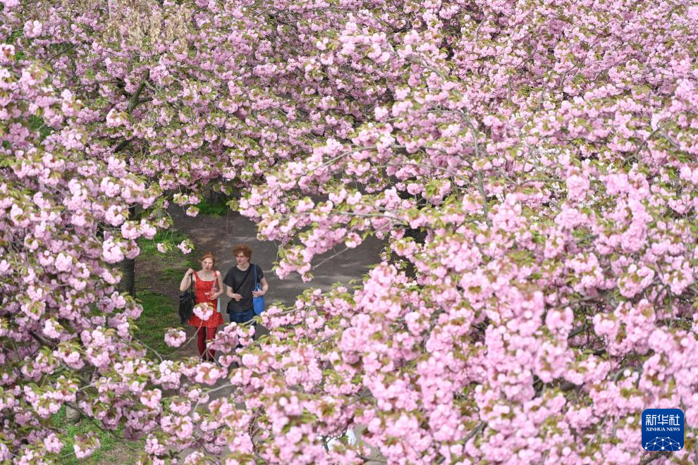 4月9日,在德国柏林,人们走在盛开的樱花树下。