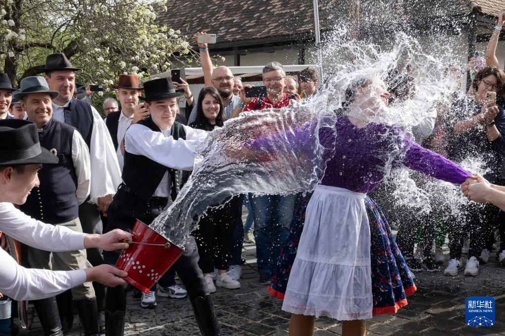 4月1日,在匈牙利霍洛克村,当地男子向姑娘身上泼水。
