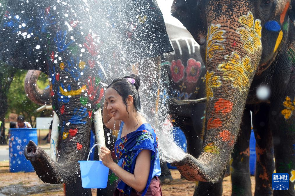 4月9日,在泰国大城府,人们与大象互相泼水迎接即将到来的宋干节。