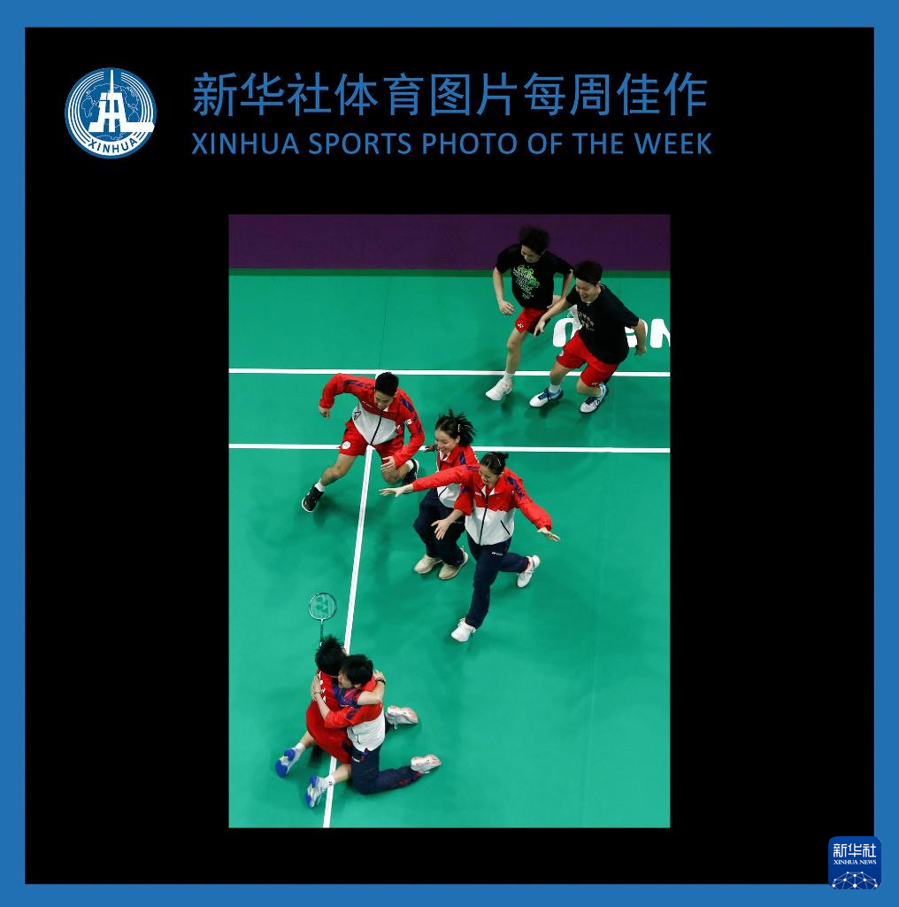 5月5日,中国队选手何冰娇(下左)在女子单打比赛获胜后与队友庆祝。何冰娇2比1战胜印度尼西亚队选手瓦多约。