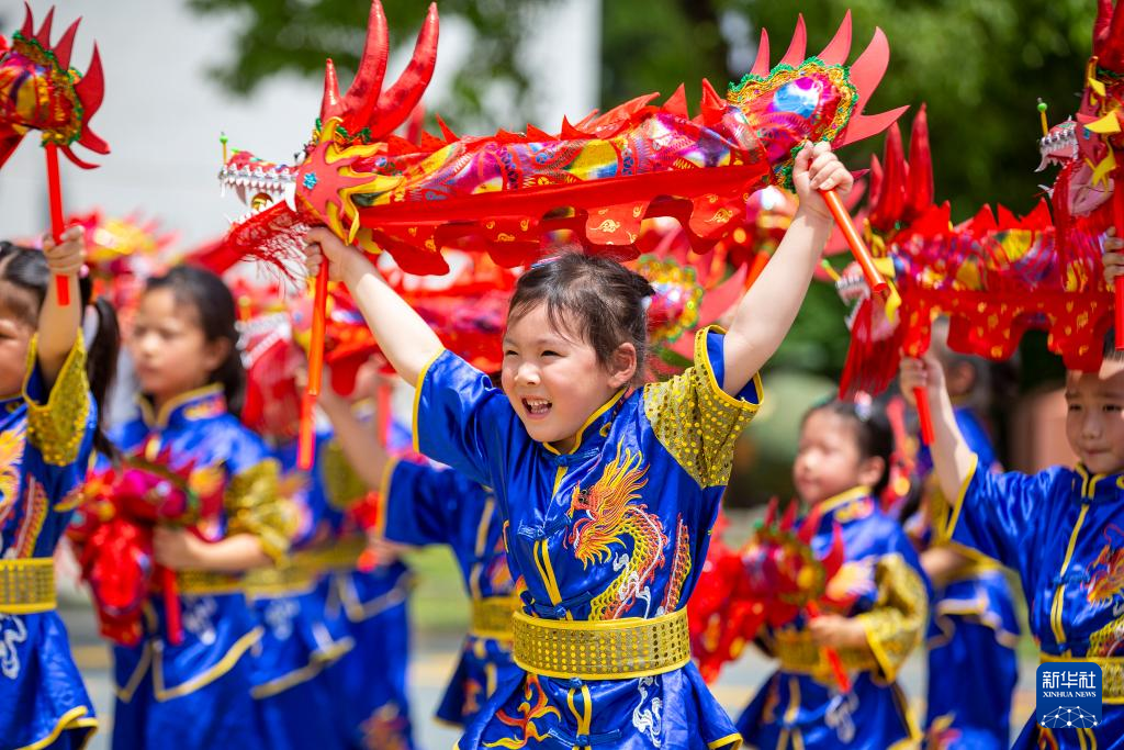5月31日,江苏海安高新区海北幼儿园的孩子们在表演舞龙。
