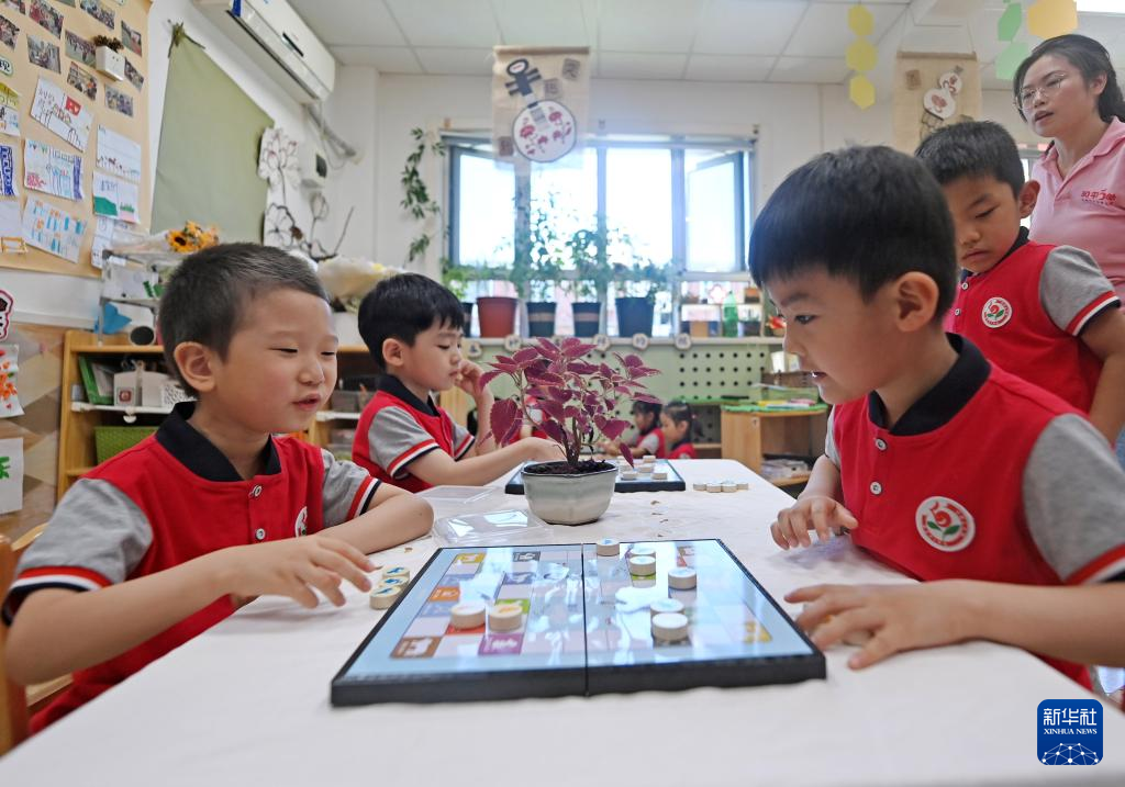 5月31日,在天津市和平区第五幼儿园,小朋友们在下棋。