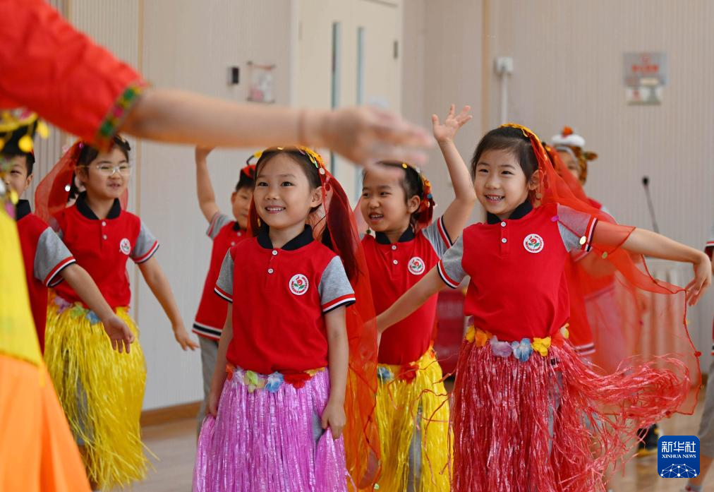 5月31日,在天津市和平区第五幼儿园,小朋友们在老师带领下体验民族舞。