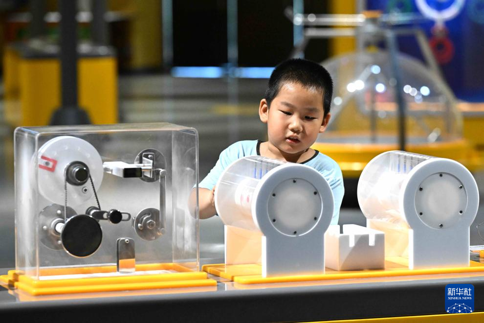 5月31日,小朋友在河北省石家庄市科技馆体验项目。