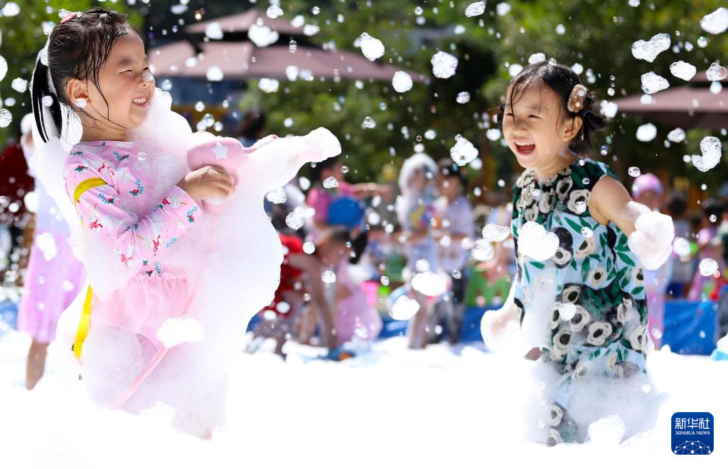 5月31日,贵州省印江土家族苗族自治县第二幼儿园的孩子们在泡泡派对上玩耍戏水。