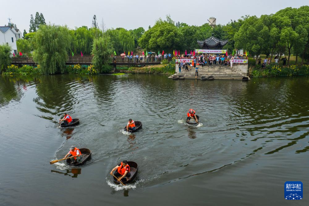 当日,浙江省湖州市吴兴区东林镇举办“庆端午 划菱桶”水乡端午趣味民俗活动,来自东林镇各村的村民们在泉益村参加了水乡划菱桶比赛、荷塘钓小龙虾、做艾草花束、包粽子等端午趣味民俗活动,在初夏时节呈现江南水乡特有的迎端午气氛。