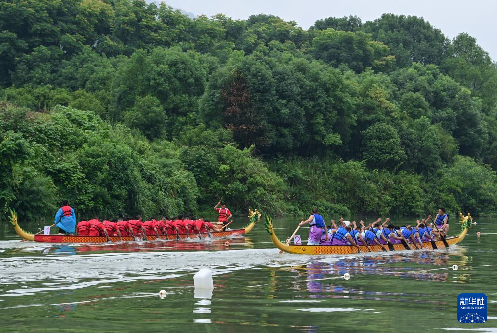 5月29日,在酉阳县龙潭镇,龙舟队在水面角逐。