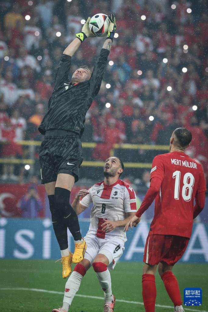 6月18日,土耳其队守门员梅尔特·古诺克(上)在比赛中救球。
