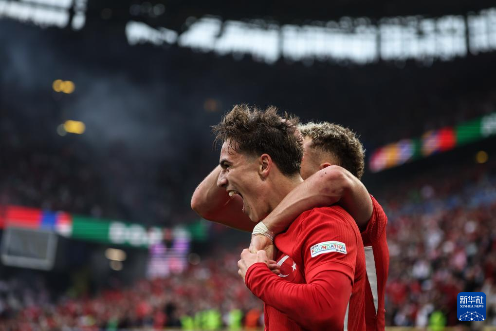 6月18日,土耳其队球员伊尔迪兹(左)在进球后庆祝,随后主裁判根据VAR(视频助理裁判)判定该进球无效。