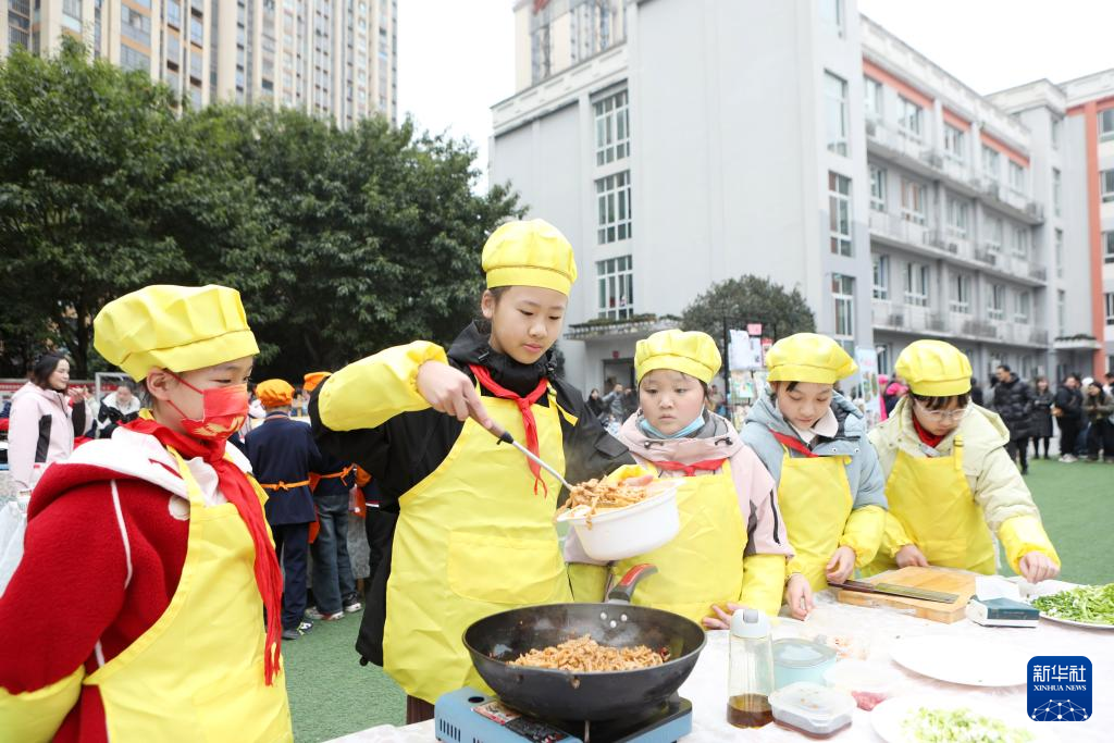 2月16日,在重庆市永川区红专小学,学生们参加“第三届生活节暨读书节”中的烹饪比赛,迎接新学期。