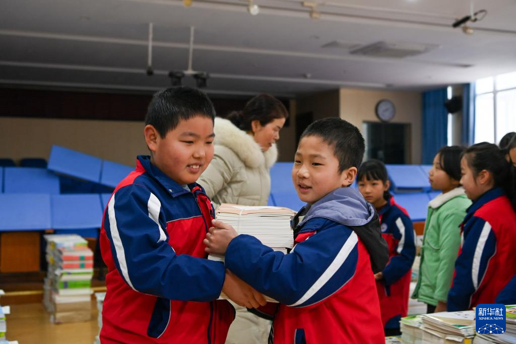 2月16日,宁夏银川市金凤区第一小学学生在教室里准备领取新课本。