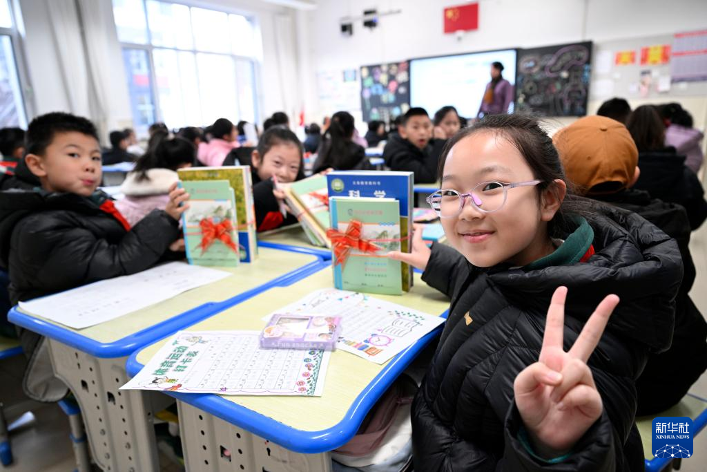 2月16日,宁夏银川市兴庆区实验二小学生在展示领到的新课本。
