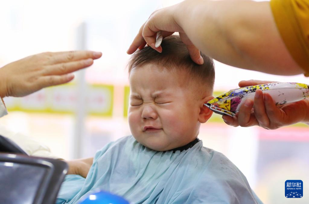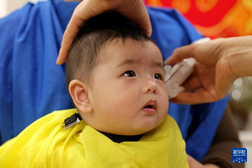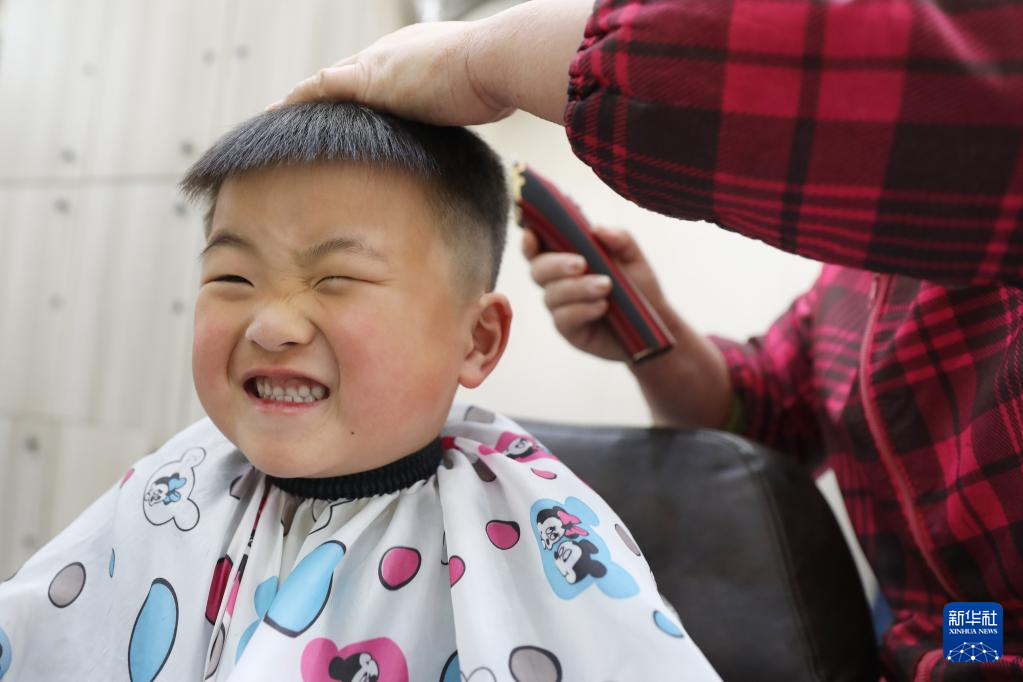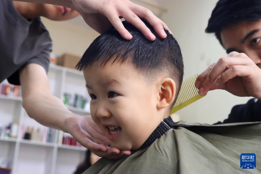 3月1日,小朋友在山东省滨州市一家理发店理发。