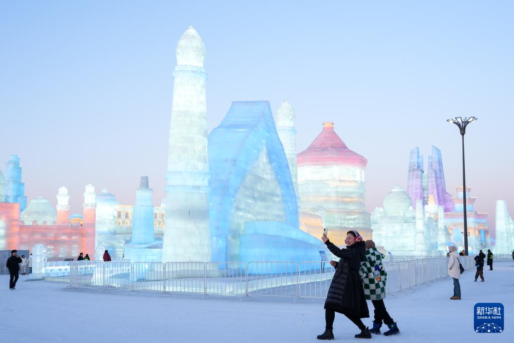 2月26日,游客在哈尔滨冰雪大世界园区内游玩拍照。