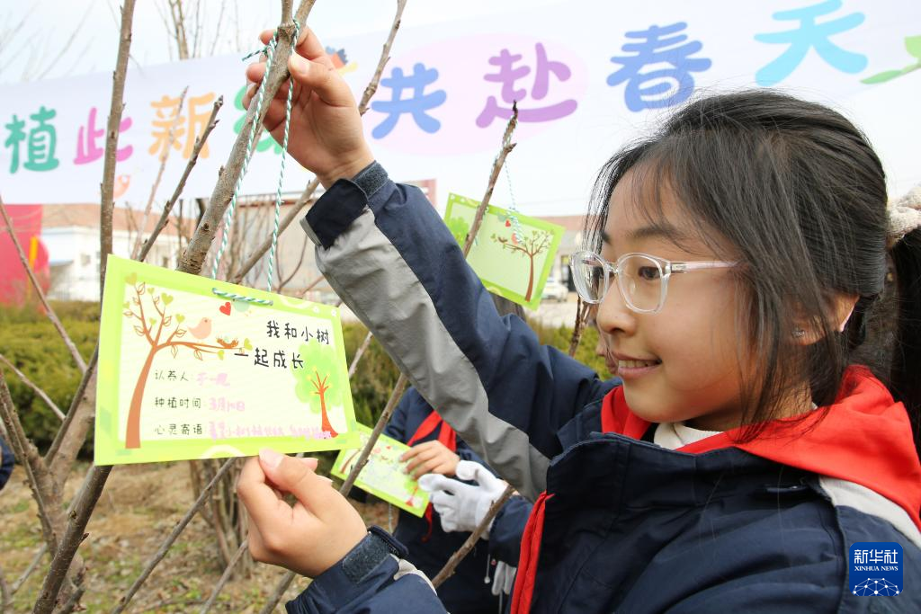 3月10日,江苏连云港市板桥小学学生将写有“我和小树一起成长”等内容的心愿卡挂在树枝上。