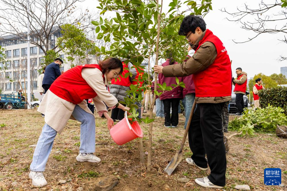 3月10日,青年志愿者在江苏泰州学院济川校区参加植树活动。