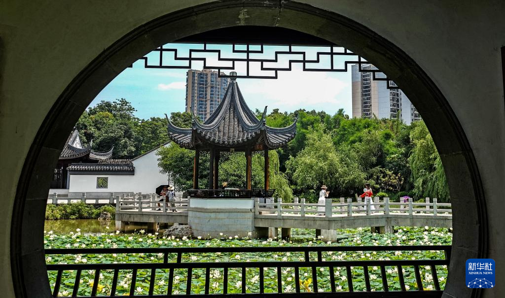 游人在广西南宁市花卉公园的荷塘观赏荷花。