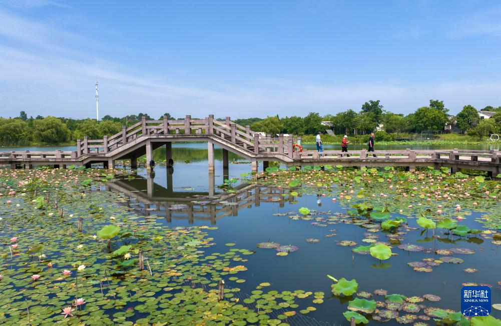 游客在浙江省湖州市长兴县泗安镇仙山湖国家湿地公园观赏睡莲(无人机照片)。