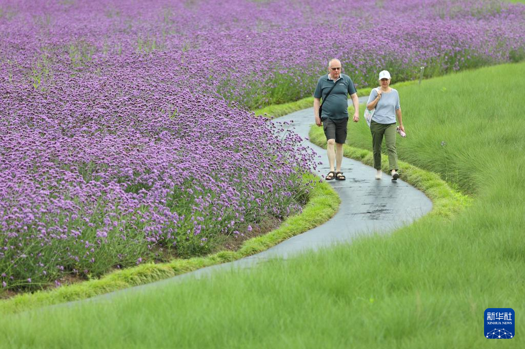 游客在浙江省嘉兴经济开发区姚家荡公园马鞭草花海中休闲。
