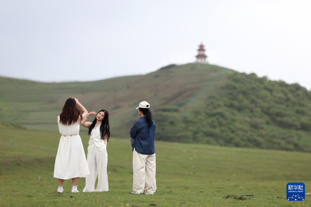 游客在狼渡湿地草原游玩(6月10日摄)。