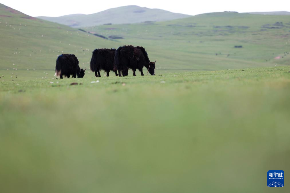 牛群在狼渡湿地草原上吃草(6月10日摄)。