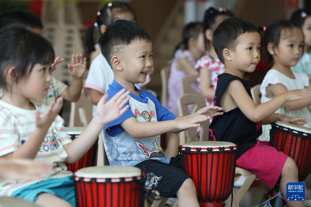 7月7日,小朋友在湖南省永州市道县爱心暑托班学习非洲鼓。