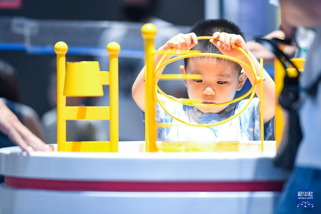 7月8日,小朋友在河北省科学技术馆体验科普设备。