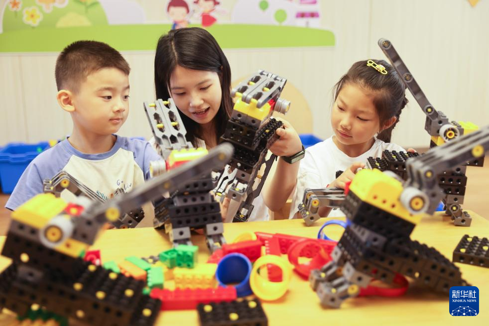 7月7日,在浙江省湖州市德清县乾元镇直街社区青少年宫,孩子在老师指导下组装积木。