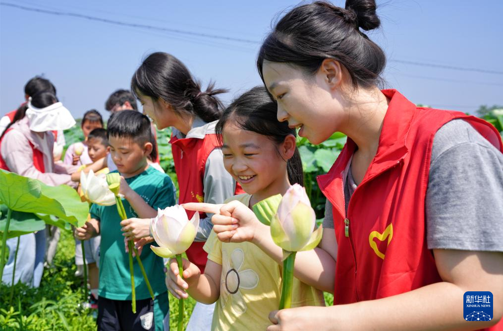 7月7日,在江苏省海安市墩头镇千步村,南京工业大学建筑学院大学生志愿者在浅水藕田边教小学生认识荷花和莲蓬。