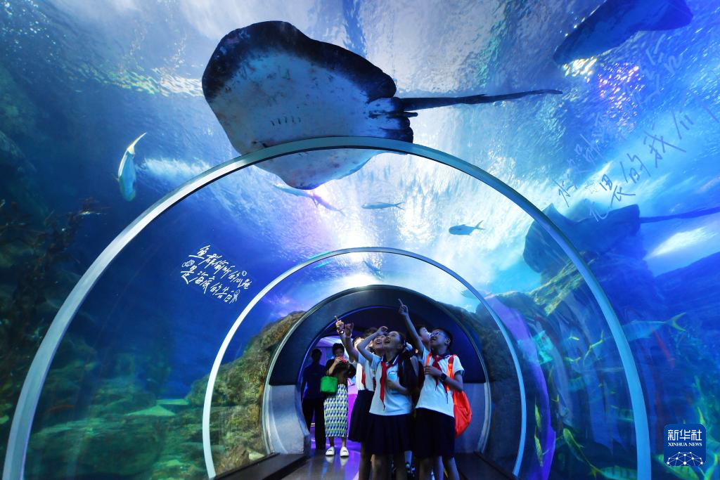 7月8日,山东省青岛市市北区东胜路小学的孩子们在“海底隧道”参观。