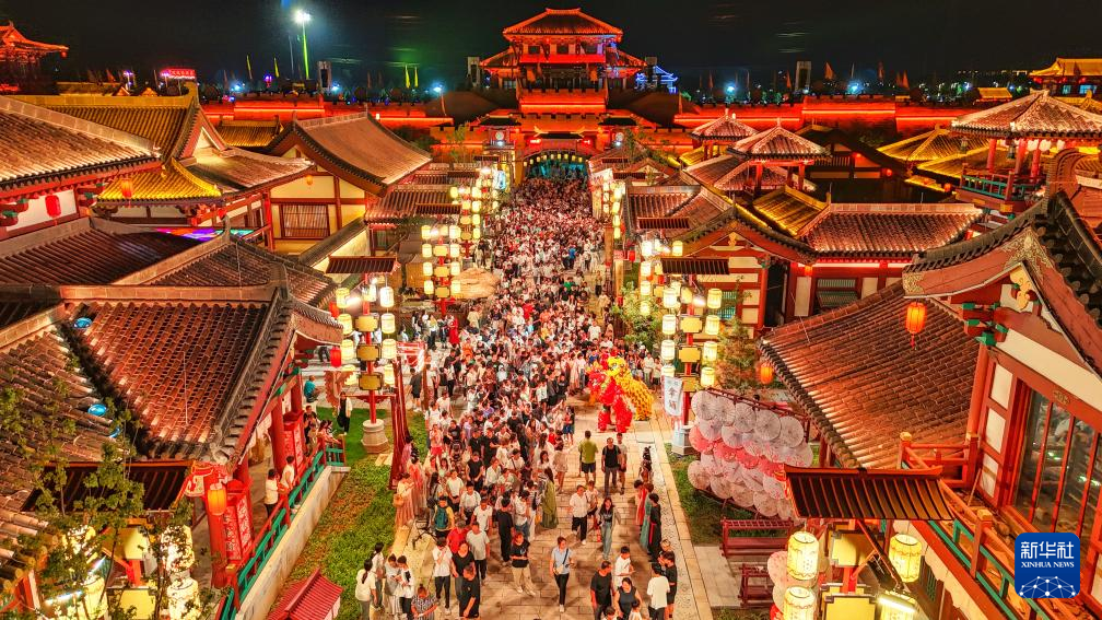 8月9日,山东乐陵影视城景区流光溢彩、游人如织(无人机照片)。