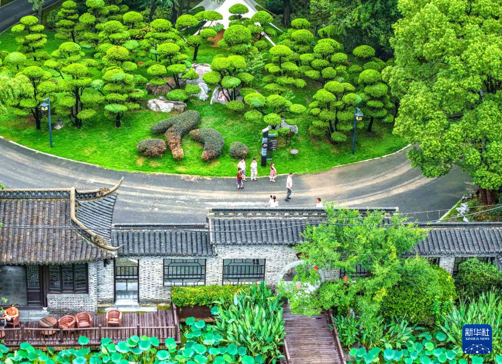 8月10日,游客在江苏省扬州市江都区丁伙镇朴园游玩(无人机照片)。