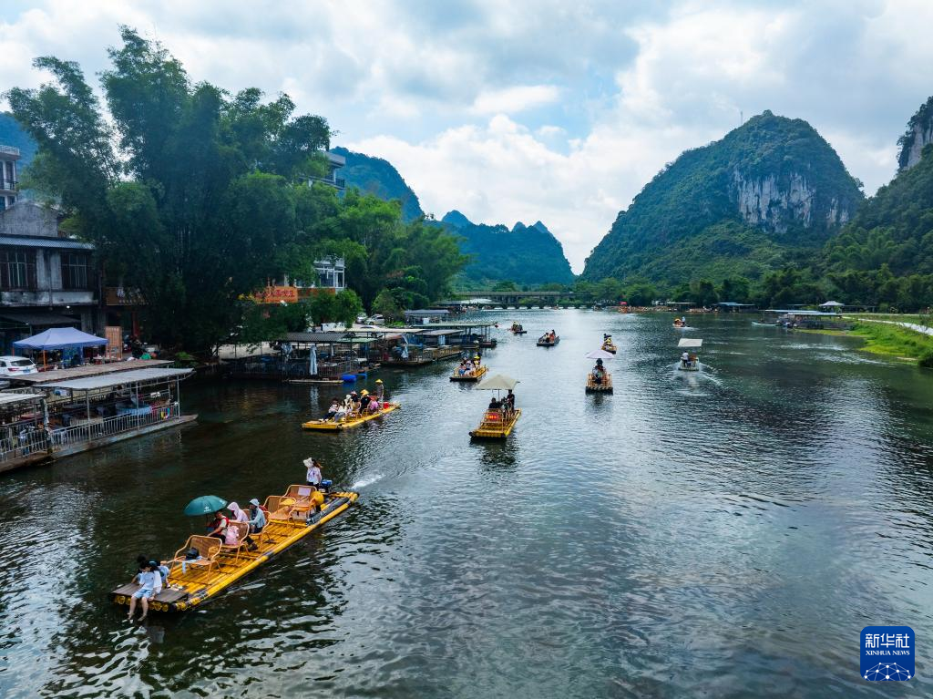 8月9日,游客在广西百色靖西市鹅泉景区乘坐竹筏游览。