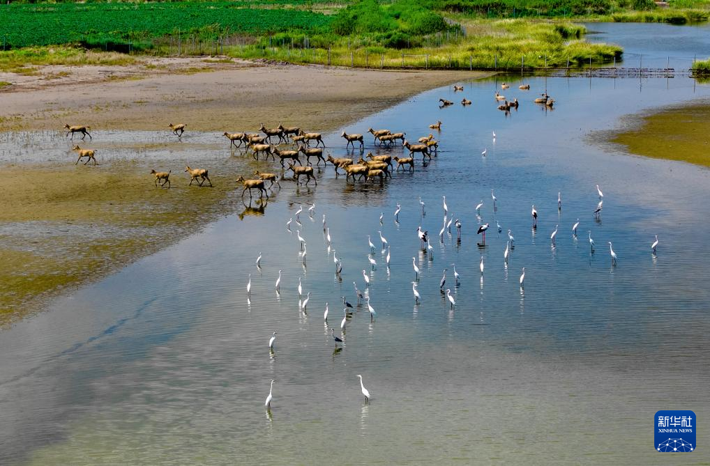 9月15日,候鸟与麋鹿在江苏东台条子泥湿地栖息、觅食(无人机照片)。