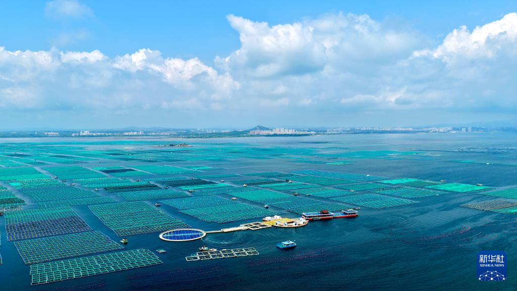 9月14日,游客乘坐游艇在山东省荣成市石岛管理区桑沟湾海洋牧场观赏海上生态养殖和碧海蓝天美景(无人机照片)。