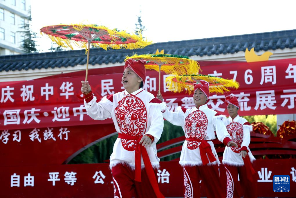 9月25日,在河南省洛阳市汝阳县刘伶广场,汝阳县牡丹艺术团在表演陕西大秧歌《红歌大联唱》。