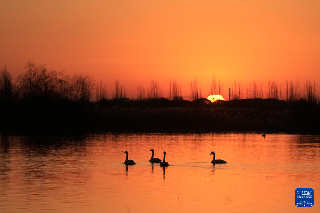 11月14日,几只大天鹅在甘肃张掖国家湿地公园水面游弋。