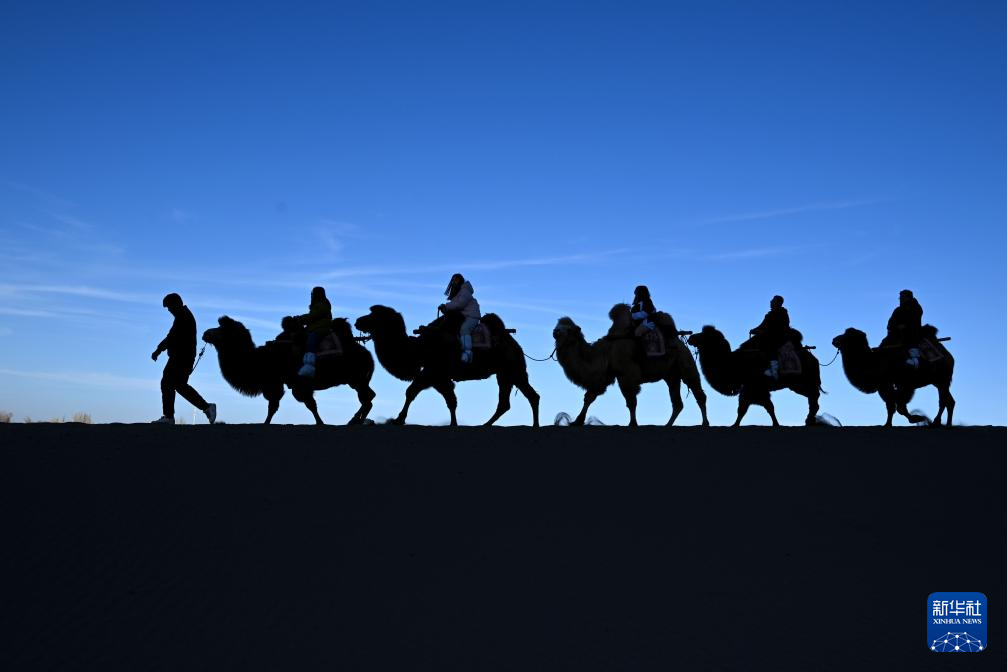 11月30日,游客在甘肃省敦煌市鸣沙山月牙泉景区游览。