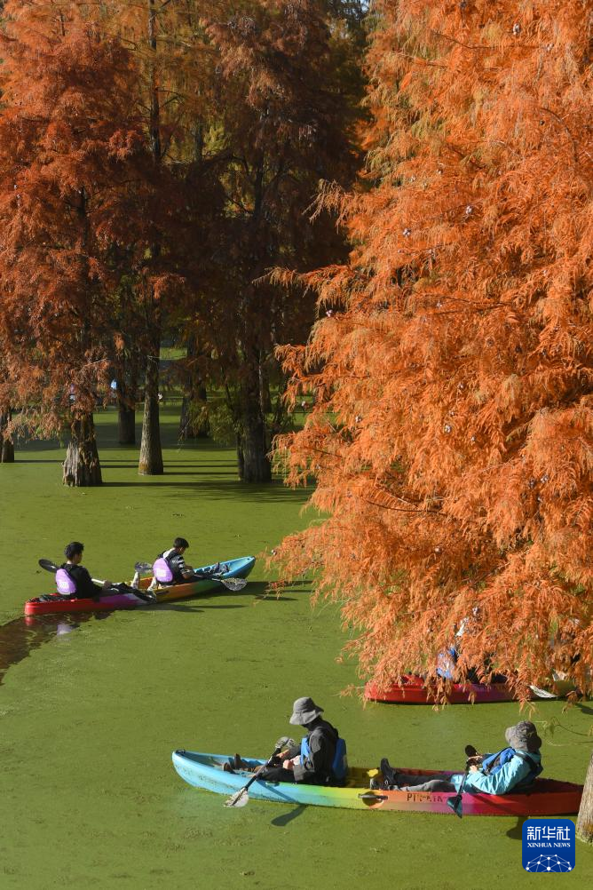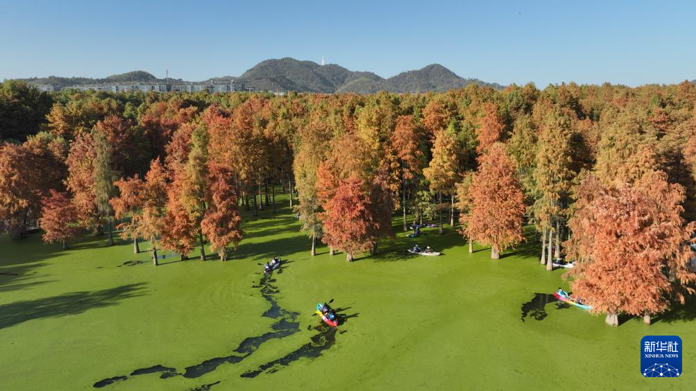 随着气温降低,浙江省杭州市青山湖的近百亩池杉、落羽杉披上色彩斑斓的“衣装”,和水面碧绿的浮萍相映成景。