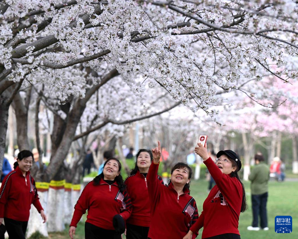 近日,山东省济南市气温回升,五龙潭公园内大面积种植的樱花进入盛开期,吸引众多市民前来观赏。