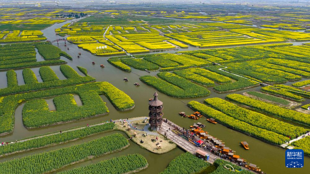 3月23日,游客在江苏省兴化市千垛景区赏花游玩(无人机照片)。