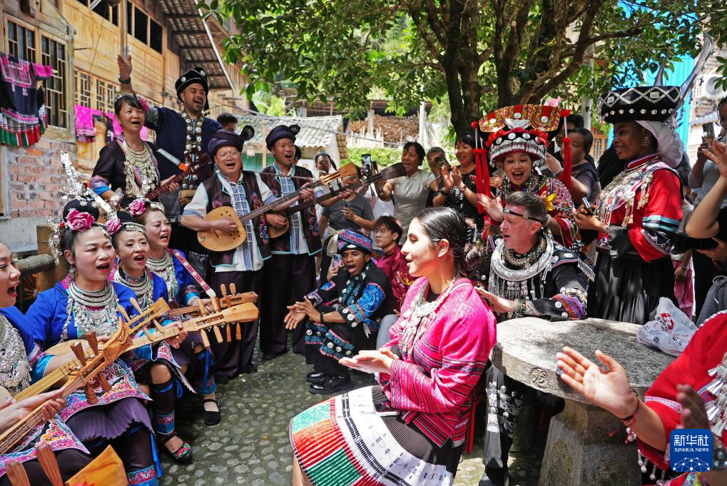 4月19日,在广西桂林市龙胜各族自治县龙脊镇金江村黄洛瑶寨,当地群众和外国友人对山歌。