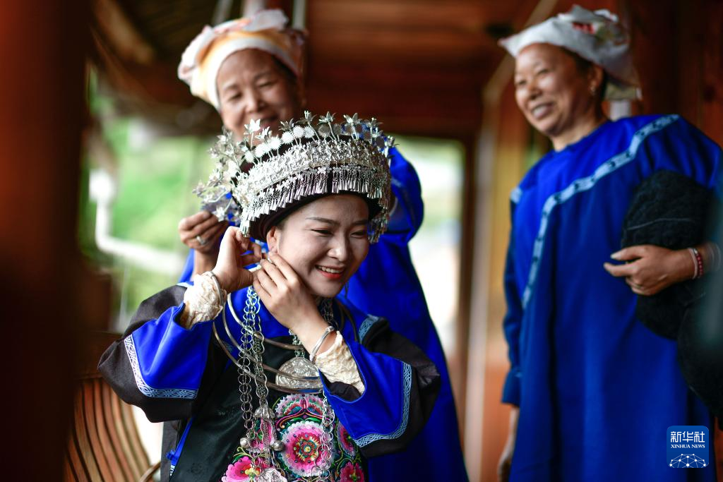 4月19日,在贵州省镇远县报京侗寨,参加“三月三”民俗活动的侗族群众在整理节日服装。