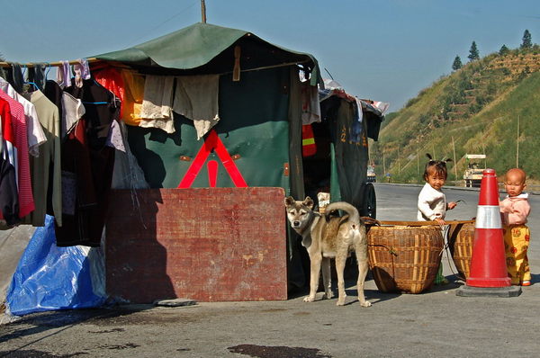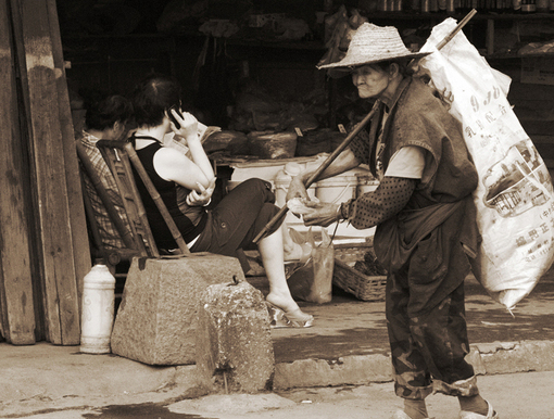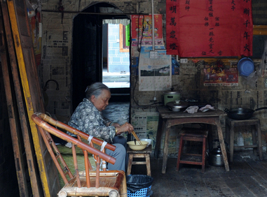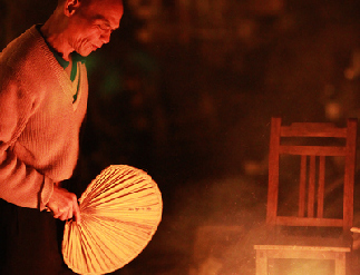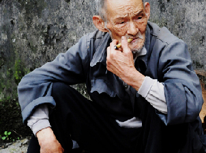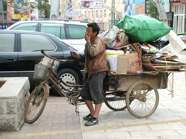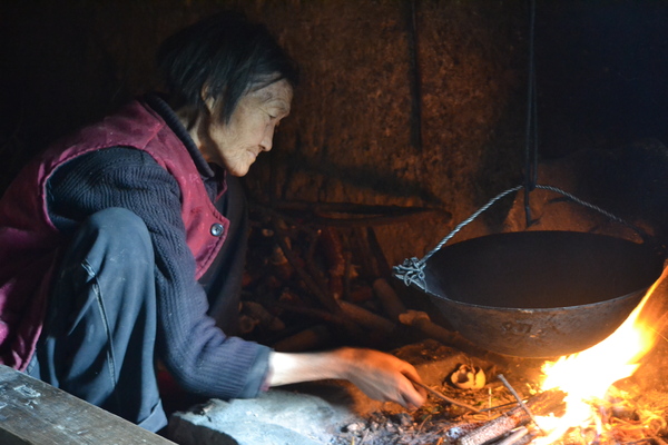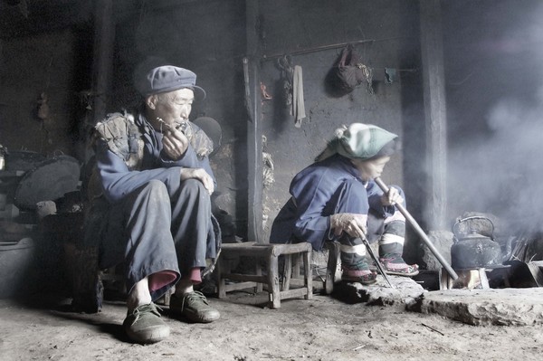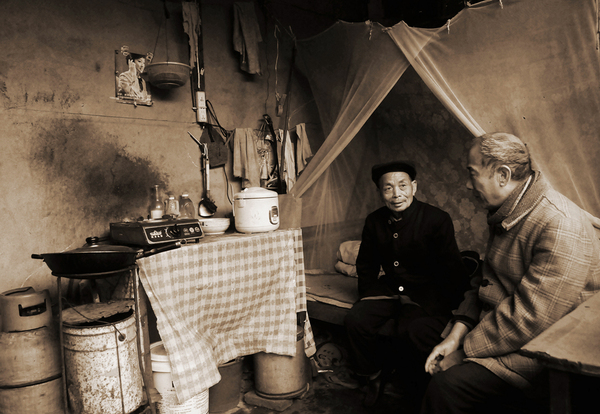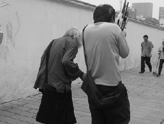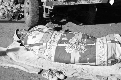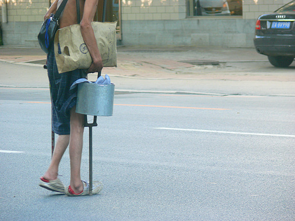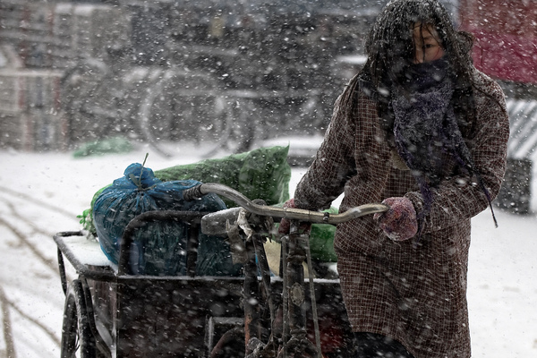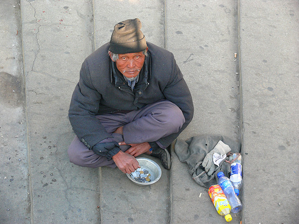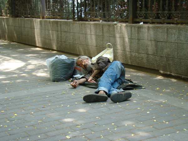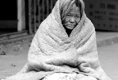 一位街头露宿者用扇子为取暖用的火盆鼓风